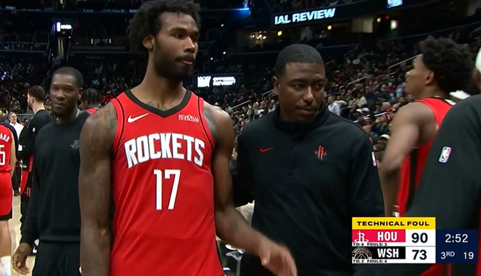 第三节开场杜兰特连拿7分,随后阿门连拿12分,火箭队直接将分差拉开到18分。两队爆发了小冲突,伊森故意推搡了沃特金斯,随后两人近身推搡,裁判先将场边喷垃圾话的特雷杨驱逐,随后给了伊森两个T,因为伊森是连续两次推人他也被驱逐,裁判的哨子开始紧卡佩拉被吹进攻犯规乌度卡挑战,三节打完火箭领先奇才14分。